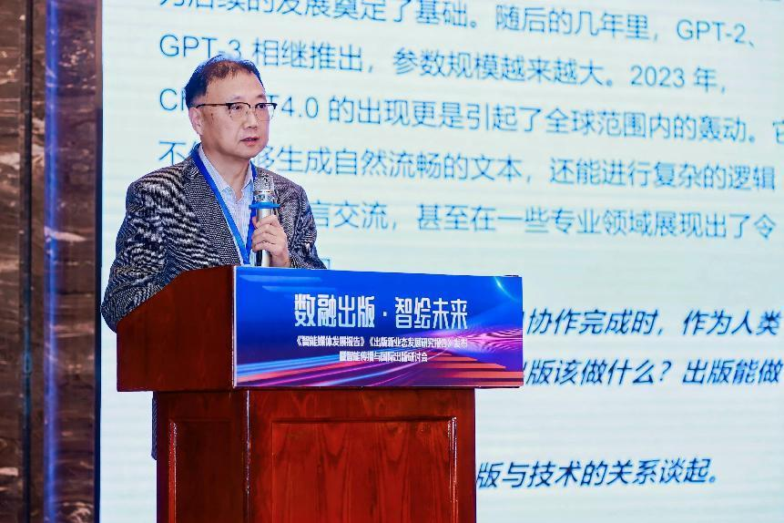 陕西师范大学新闻传播学院教授王勇安作题为《以“雕虫小技”落实宏大叙事——“文正AI智慧出版系统”的开发体会》的报告。他提出泛在、共创、共享的智慧出版是数智时代出版业态的应然之需,并详细介绍了新开发的文正智慧出版系统,以推进图书出版的全媒体化、全流程化、全平台化。