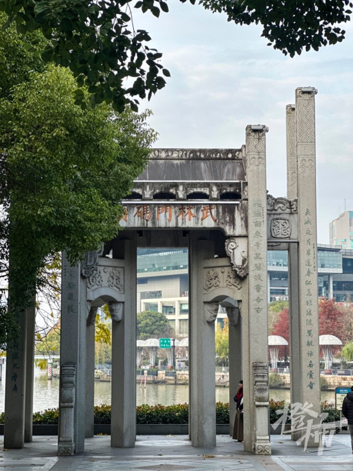 在西湖文化广场对面是武林门码头,它的标志性石牌坊十分独特,大运河在此处形成一个美丽的九十度拐弯。