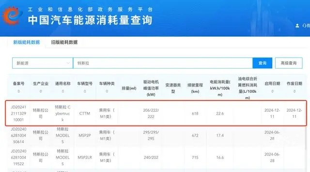其实特斯拉赛博越野车在12月11日已经完成了工信部汽车能源消耗量测算申报。数据显示,赛博越野旅行车百公里能耗22.6度,续航里程618km,车辆种类为乘用车。当天,众多媒体都给予了高度关注,甚至把这一消息解读为“赛博皮卡即将进入国内”。