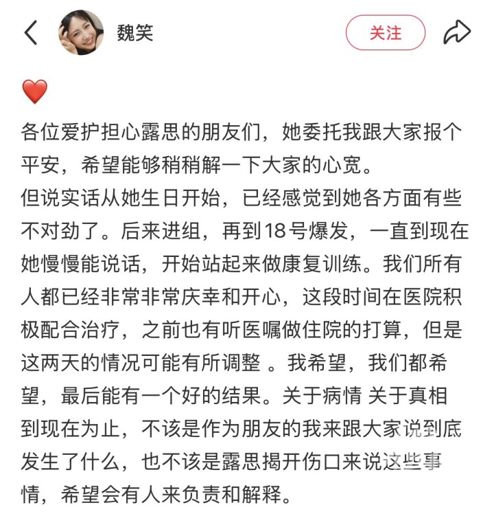 12月28日,赵露思好友魏笑发文替其报平安。“各位爱护担心露思的朋友们,她委托我跟大家报个平安,希望能够稍稍解一下大家的心宽。但说实话从她生日(11月9日)开始,已经感觉到她各方面有些不对劲了。后来进组,再到18号爆发,一直到现在她能慢慢说话,开始站起来做康复训练。”
