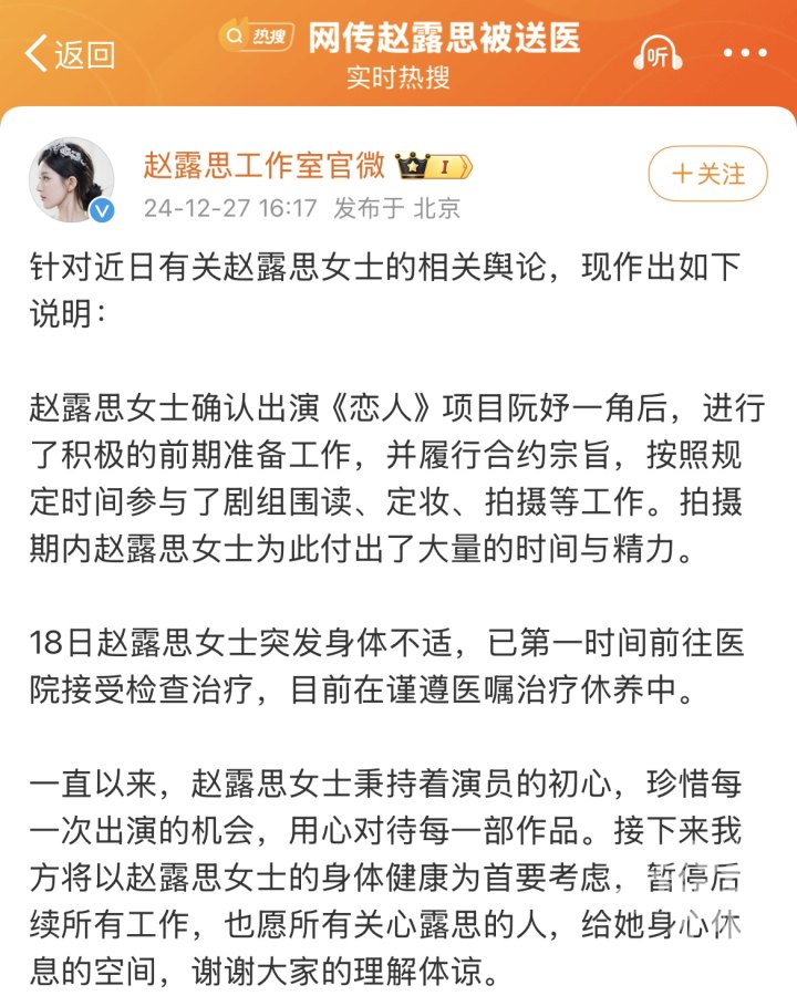 12月27日,赵露思工作室官微发布的说明中提到“18日赵露思女士突发身体不适,已第一时间前往医院接受检查治疗,目前谨遵医嘱治疗休养中”“接下来我方将以赵露思女士的身体健康为首要考虑,暂停后续所有工作”。