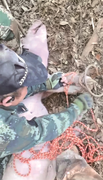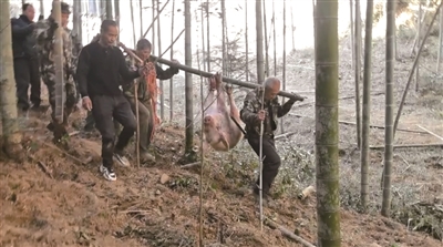 300多斤重的猪,4个人抬不动,陈队长犯了难,马上联系杜大伯,说抓住了,得请村里几个人帮忙。可村里过来差不多要1个多小时。“我们不能在那里干等着,能拖多远算多远,好在是下山的坡路,猪被绑着往下滚了一段距离。”