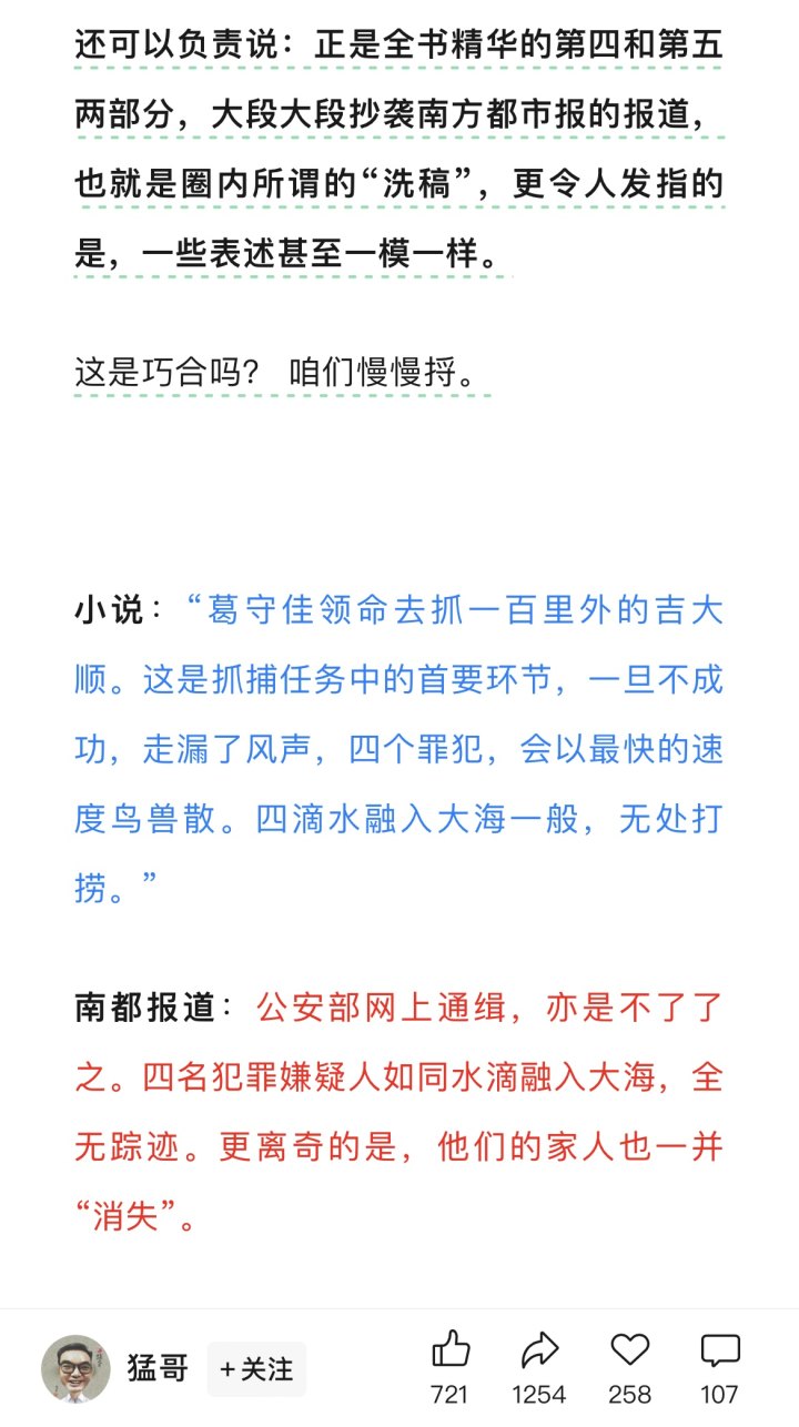 对于陈枰的回应,今天下午王猛再次发文《实锤!爱奇艺〈漂白〉》抄袭!!》,并晒出调色盘,“还可以负责说:正是全书精华的第四和第五两部分,大段大段抄袭南方都市报的报道,也就是圈内所谓的‘洗稿’,更令人发指的是,一些表述甚至一模一样。”