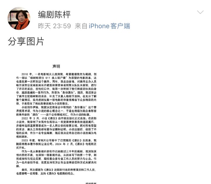 昨日深夜23:59,《漂白》编剧陈枰发文否认抄袭。