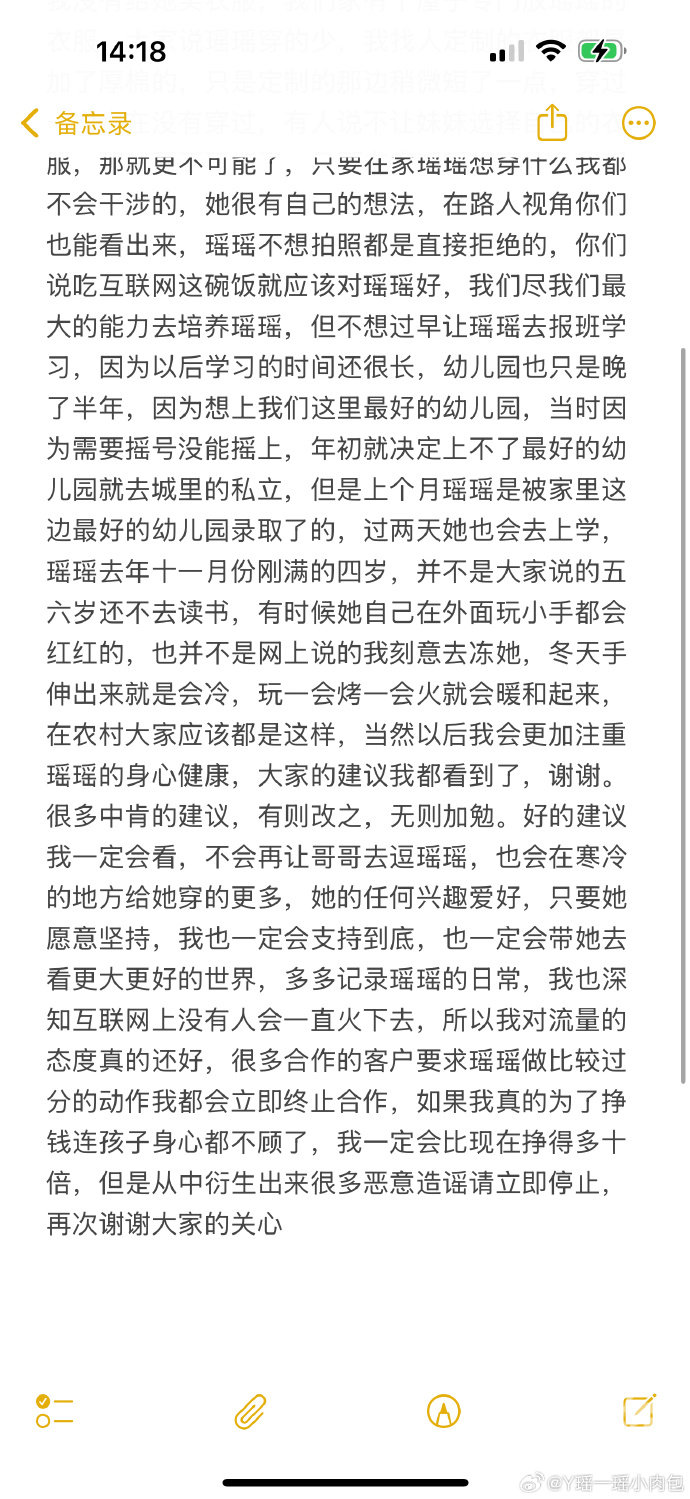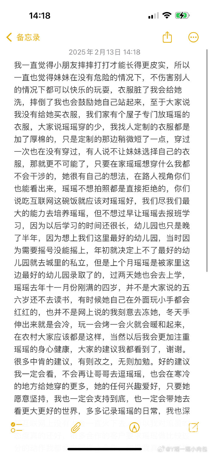 13日,“瑶一瑶小肉包”母亲在账号发布回应:“我一直觉得小朋友摔摔打打才能长得更皮实,所以一直也觉得妹妹在没有危险的情况下,不伤害别人的情况下都可以快乐的玩耍,大家的建议我都看到了,谢谢。很多中肯的建议,有则改之,无则加勉。如果我真的为了挣钱连孩子身心都不顾了,我一定会比现在挣得多十倍,但是从中衍生出来很多恶意造谣请立即停止,再次谢谢大家的关心!”