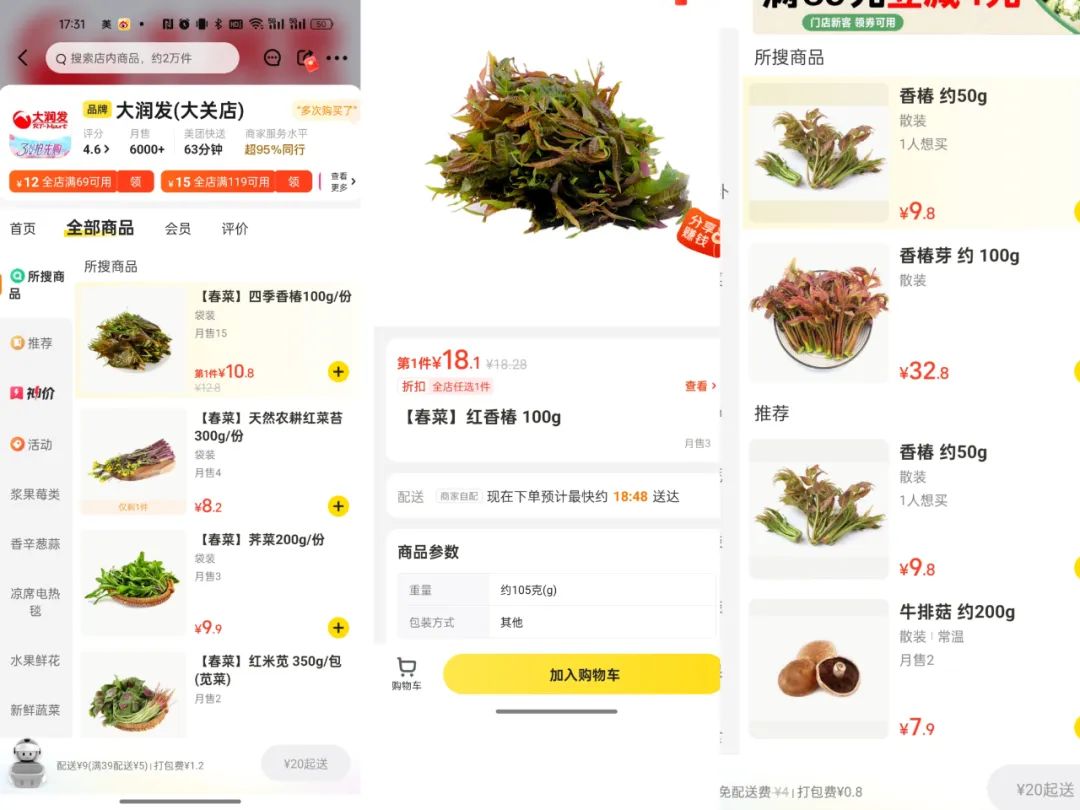除此之外,杭州也有不少商超陆续开卖香椿,一份100g香椿的价格大概在10~35元,也就是50~120元/斤不等。比如,盒马鲜生代购(延安路店)的红香椿100g售价18.1元;大润发(大关店)100g的四季香椿售价10.8元;蔬菜到家(朝晖六区农贸市场店)约50g香椿芽价格是9.5元,100g香椿芽价格是32.8元。