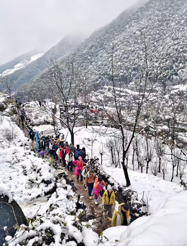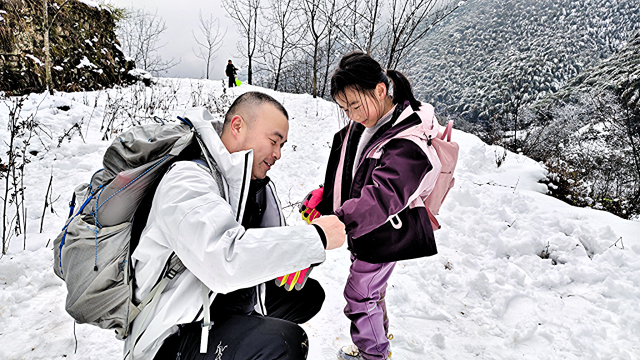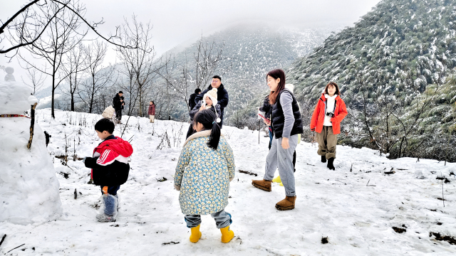 23日上午,在通往百丈岭、太子尖的路上,像吴纳生这样三五好友结伴而来的团队比比皆是,举家出动的也不计其数。“今年湖州没有下雪,所以就一直在网上翻找附近赏雪的好去处,恰好听朋友说临安的雪景堪称一绝,所以就特地选了这儿。”早上八点,陶冶和九岁的“龙凤胎”儿女就已在百丈岭上撒起欢来,又是打雪仗,又是堆雪人,玩得不亦乐乎。陶冶说:“我去过很多玩雪赏雪的地儿,像百丈岭这么壮观的还是头一回看见,这一趟来得太值了!”