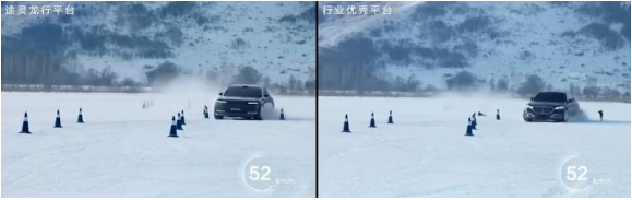 现场还发布了一段尊界S800和迈巴赫S680在零下20℃的极寒环境下的测试视频。测试内容包括紧急避让,尊界S800在80公里时速下完成紧急避让后继续平稳行驶,而迈巴赫S680在50公里时速时就因为轮胎打滑,车身失控偏离预定路线。