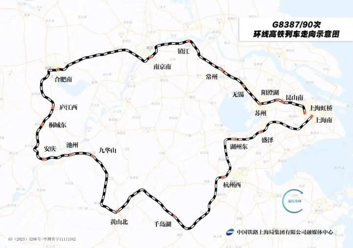 而这一列车的始发站,同样是位于上海境内的上海南站,意味着列车从上海出发后,经过了浙江境内的杭州、湖州等地,安徽境内的合肥、黄山、安庆等地,江苏境内的南京、苏州、无锡等地,最终回到上海,是环线高铁。