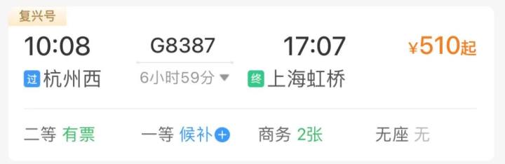 我们进行了一番查询,发现确实有这么一班高铁列车——G8387次列车,10点08分从杭州西站发车,17点07分到达上海虹桥站,全程耗时6小时59分,二等座票价510元。