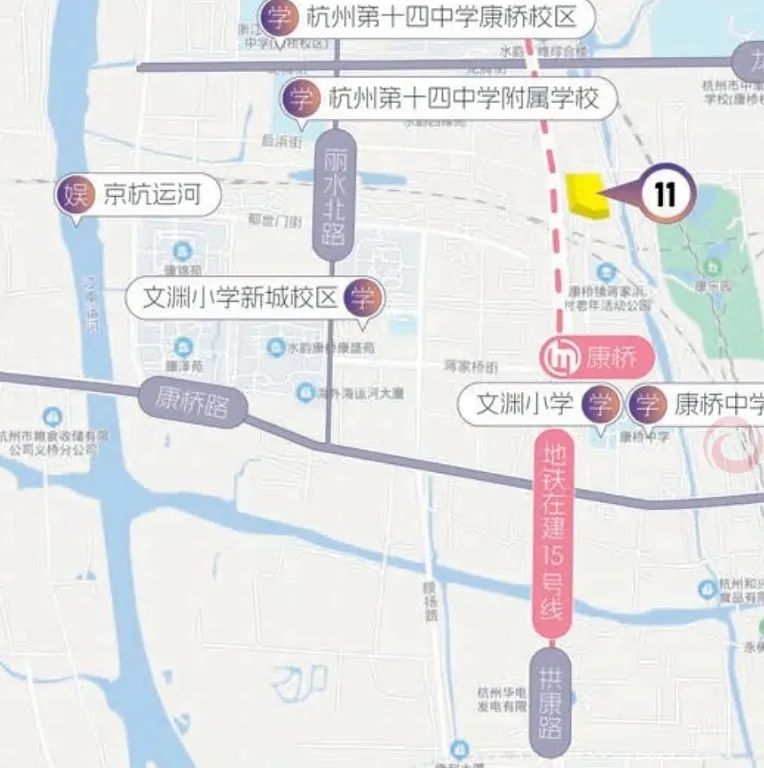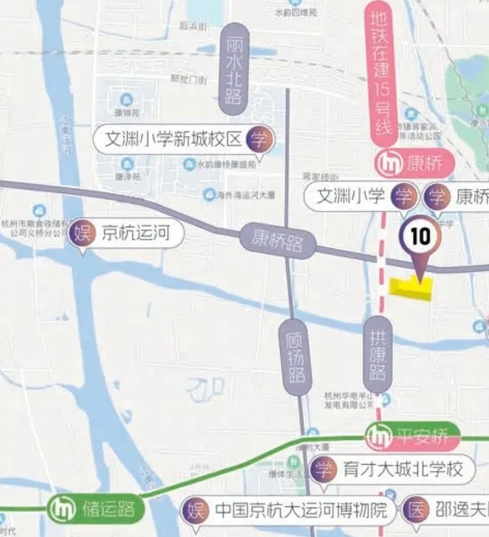 该地块位于康桥路与拱康路交汇口,距离地铁4号线、在建15号线平安桥站约680米,距离15号线康桥站480米,交通通达。附近有邵逸夫医院大运河院区、育才大城北学校、康桥中学、文渊小学、独城生态公园等完善配套。