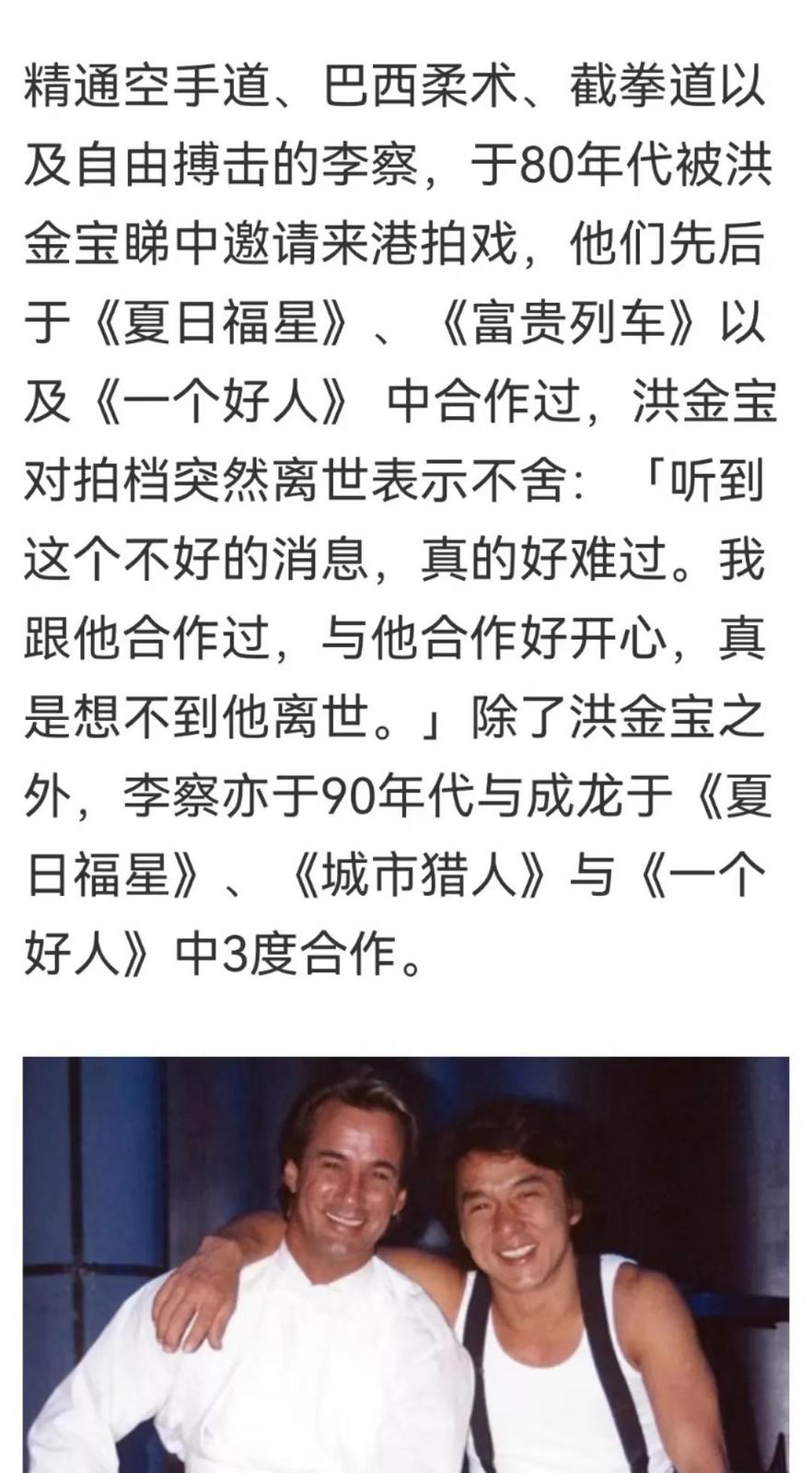 洪金宝对拍档突然离世表示不舍:“听到这个不好的消息,真的好难过。我跟他合作过,与他合作好开心,真是想不到他离世。”