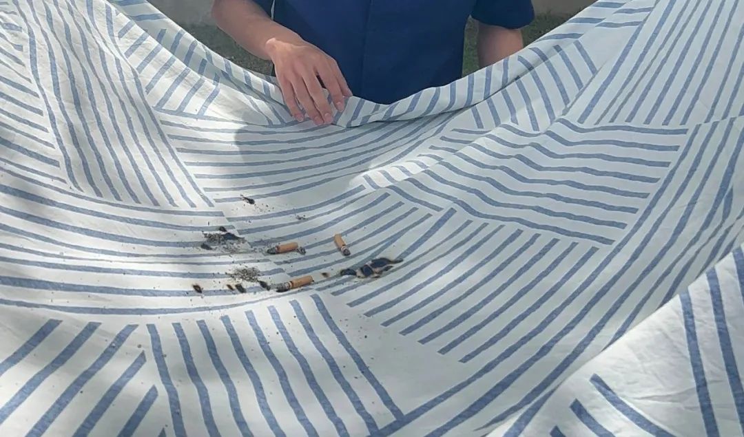最后,工作人员还模拟高空抛物,将未熄灭的烟头扔到了晾晒的床单上面。3分钟后,床单已被烟头烫破,出现若干个黑色小洞。如果被套中有鸭绒、鹅绒等物质,极易点燃,并产生火灾。