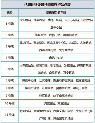 为解决市民游客携带行李出行不便的问题,杭州在地铁站点推行“轻松游”行李自助寄存服务,杭州地铁已在毗邻景区、交通枢纽等39座大客流车站,设置了42个点位共398个柜格的“行李自助寄存柜”,假期供不应求。