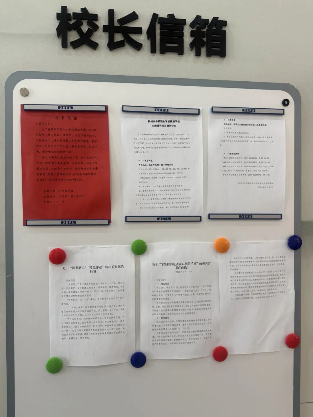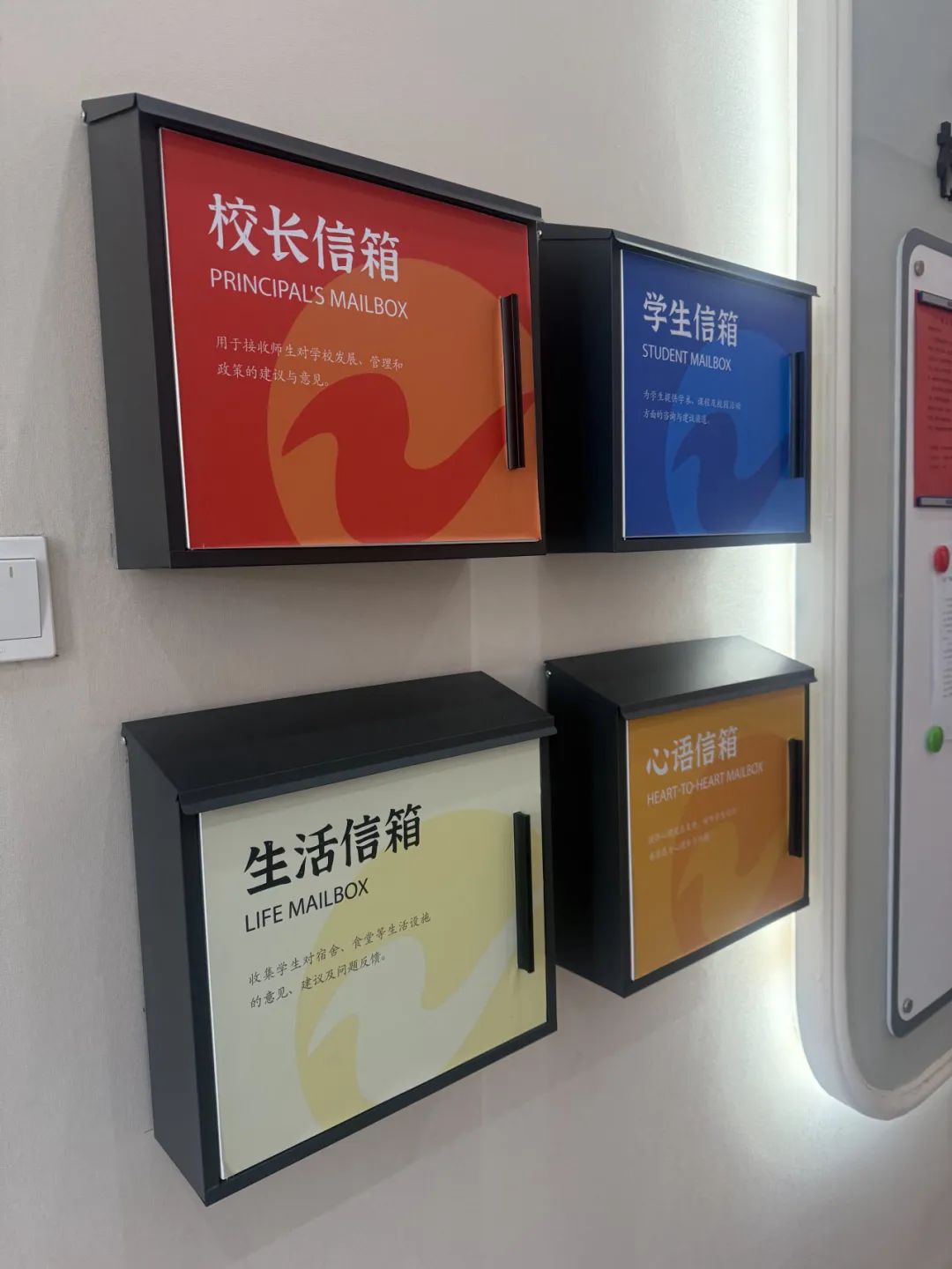 在中策钱塘学校,除了一个用于接收师生对学校发展、管理和政策建议方式与意见的校长信箱,还有为学生提供学术、课堂及校园活动方面的咨询与建议渠道的学生信箱,提供心理健康支持、倾听学生情感困惑与压力问题的心语信箱,收集学生对宿舍、食堂等生活设施的意见、建议及问题反馈的生活信箱。