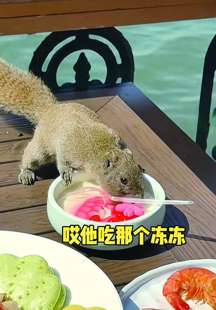 5月22日下午4点51分,网友“大仁哥探店”在社交媒体发布了一条视频,在西湖边露台吃饭时,一只小松鼠爬上餐桌,先是品尝了他们的甜点,还舔了舔西湖醋鱼的汤汁,画面非常欢乐。