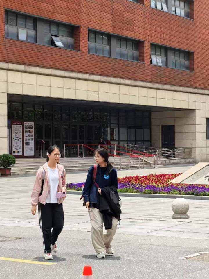 妈妈拿起手机记录下这难忘的一刻。这位女生说:“今天考试的难度还行。英语笔试部分就是考听力、词汇、语法、阅读,作文。还考了10道数学题,题目是全英文的。面试环节是给了一张图片,让我们描述图片上的场景,并问了一些衍生的问题。”