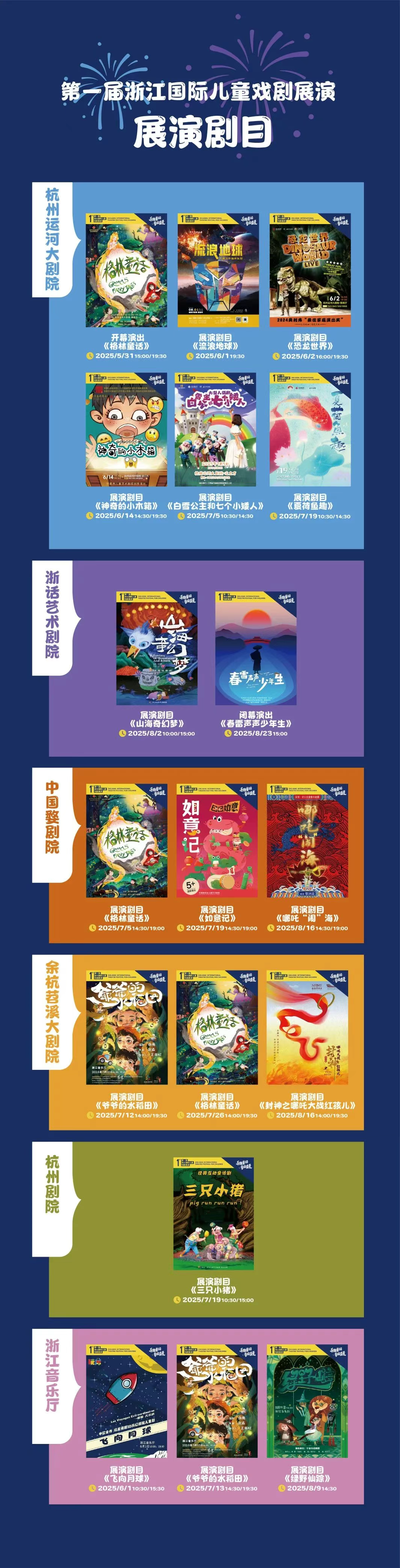 本次展演将于5月至8月期间在杭州及金华的6大剧场陆续上演34场儿童剧目,感兴趣的家长和小朋友们可至“浙里票务”购票,前往各个演出场馆观看精彩的演出。相信在这场艺术盛宴中,孩子们能收获欢乐与成长,儿童戏剧艺术也将在浙江这片土地上绽放出更加绚烂的光彩。