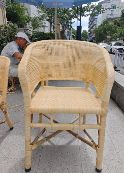 李师傅说,一把椅子首要在骨架,骨架全靠眼睛看,手上捏和扳,四平八稳,线条流畅,背靠贴身;其次在四脚的包装,藤贵在紧密,一圈半一层,收力要紧,松散用不牢;坐垫和背靠稍微容易些,要点也在于紧密,十字交叉编制,隔三差五穿插,图案呈现几何形的对称美。