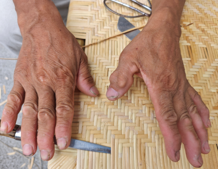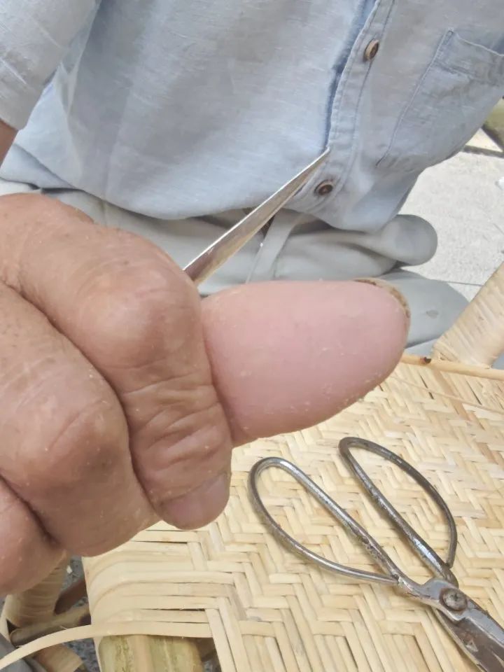 李师傅起身,握了握我的手,他的手很粗糙,拇指关节变形增生。见我注意他的手,李师傅嘿嘿一笑:“编藤椅38年,手指纹都磨没了。”