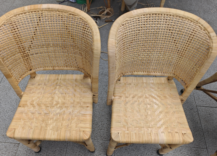 他们家的藤椅椅架用的是临安山里的竹子,每年冬至后,李师傅都到临安山里寻找合适的石竹,硬度和韧度都要好。藤条是从广州拿的货,印尼藤,藤条粗壮匀称,纤维密集柔韧。“一把好的藤椅,二三十年好用的。”