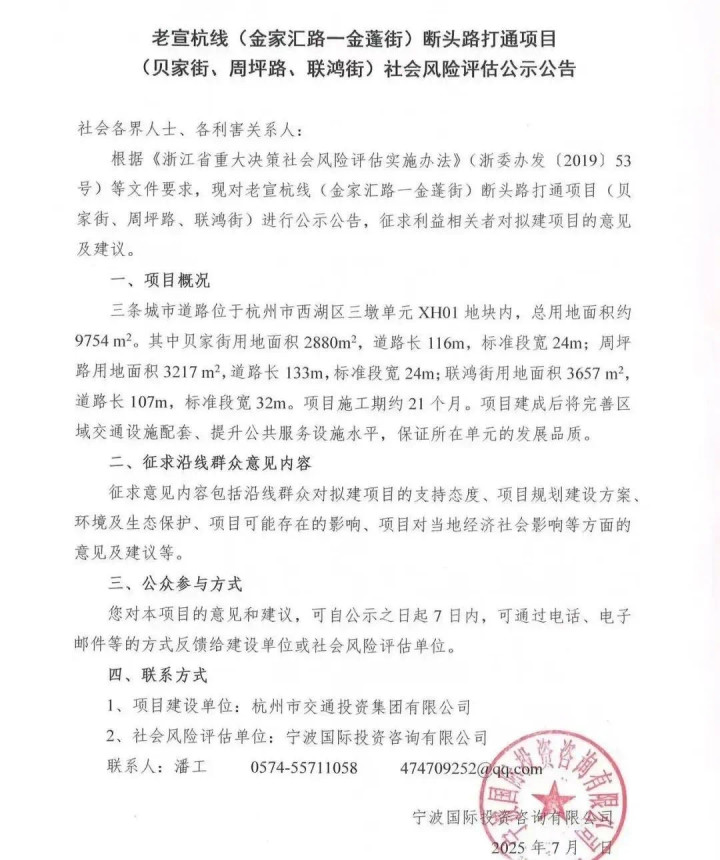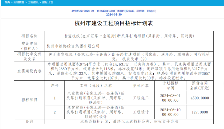 根据最新公示,老宣杭线(金家汇路-金蓬街)断头路打通项目已正式启动招标。