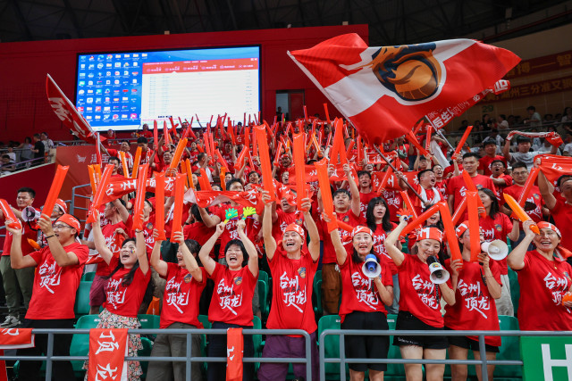 看台上,身着白色助威T恤的湖州球迷占据多数,但来自台州的红色啦啦队同样声势浩大。他们手持“台州顶龙”横幅,呐喊声丝毫不落下风。“‘顶龙’在台州方言里是‘厉害’的意思,”啦啦队长郑南解释道,“这句口号展现了我们台州人‘昂扬向上、锐不可当’的竞技精神。”据悉,这支约200人的台州啦啦队乘坐4辆大巴,历经4小时长途跋涉抵达德清,舟车劳顿并未影响他们为家乡球队助威的热情。