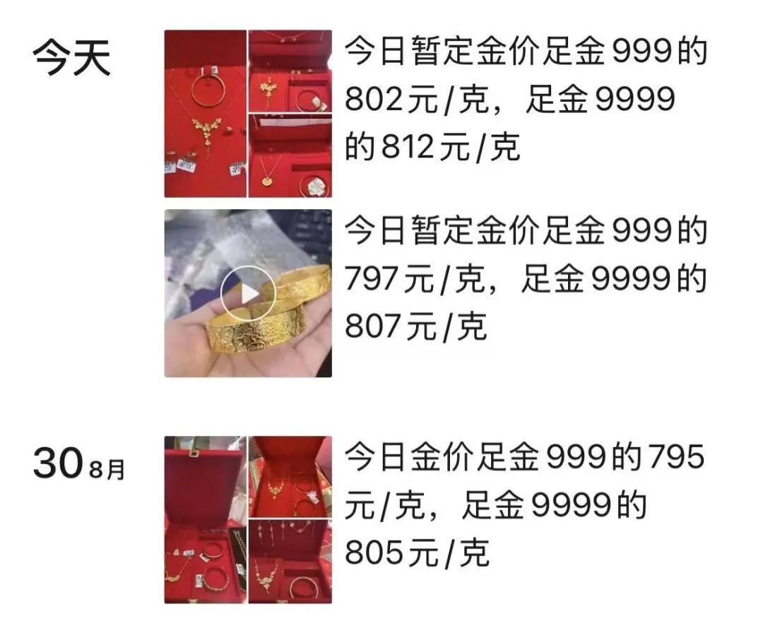 “没想到这波上涨这么猛。从8月26日开始,我们市场的足金大盘价就一天一个价,持续上涨。” 杭州白马珠宝市场一楼的商户告诉记者,9月1日一早,足金999已经涨至802元/克,为近期最高。