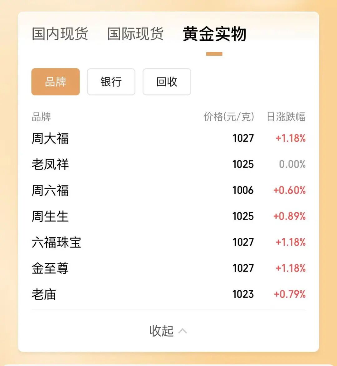 1日一早,国内金饰珠宝品牌纷纷上调了足金金饰的报价。其中,周大福、六福珠宝、金至尊这几个品牌的足金金饰最新克价均为1027元。