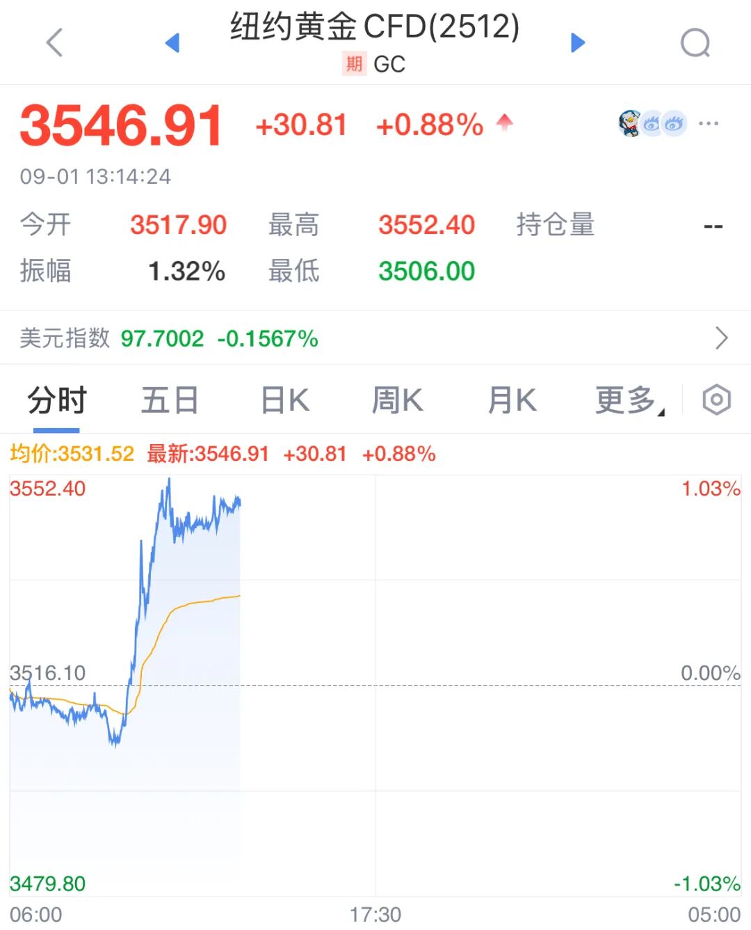 截至发稿前,纽约黄金大涨近1%,最新报价为3546美元。