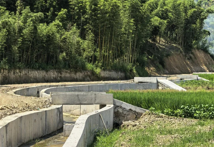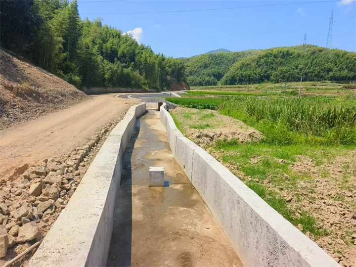 灌排渠是2024年双庙村农田基础设施建设项目的重要组成部分。田家坞地块的灌排渠挨着机耕路,从山上蜿蜒而下,一头连着杨家坞水库,另一头通往小溪流。新登镇农办主任陈亮介绍:“这条灌排渠有着‘一渠两用’的功能。当田地干涸、急需水源滋润时是灌水渠,村委会人员将水库开闸放水;遇上汛期、短时降雨迅猛等特殊天气时是排水渠,田地里多余的水通过侧面小孔流入水渠,排到小溪里。”此外,水渠中间的石墩子也有妙用,通过与一块石板的插入配合,形成区段蓄水,把水精准引入需要的地块,提供定制化的灌排水服务。