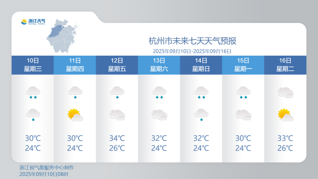 这两天杭州的最高气温从前天(8日)的39.4℃到昨天的32.9℃,这波气温“过山车”也太刺激了吧!大家是不是也像小编一样,想多多体验一下这样的“过山车”呢?从目前的预报来看,未来七天最高气温都在32~34℃左右,虽然没有大幅度的降温,但相比于前段时间动辄38、39℃的连续高温,这样的气温也算是比较“舒适”了。