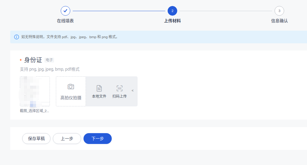 填写完成且通过系统核验的,可点击“下一步”,进入上传材料环节。请按提示的材料名称上传真实资料影像照片,并在完成上传材料后进入“信息确认”环节,对提交资料再次核实无误后提交中心处理,公积金中心将对该笔业务进行审核,审核通过后,直接将住房公积金转入中介的监管账户(中心审核后办结)。