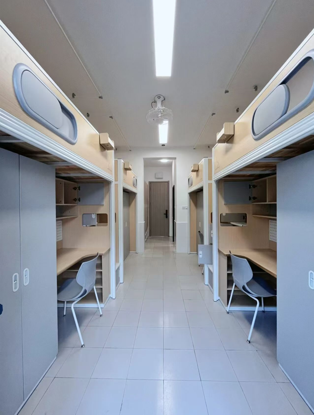 寝室内,原木风上床下桌整齐排布,静音抽屉导轨、加高床头挡板与静音衣柜兼顾实用与安全;每张学习桌均配备3个五孔插座和1个USB 接口,让学生彻底告别“插线板依赖”。卫浴区域实现干湿分离,LED 护眼灯带与镜前补光设计贴心实用;洗衣机移出阳台优化了空间布局,再加上静音风扇与升级后的照明系统,为学生营造出宁静舒心的学习生活环境。