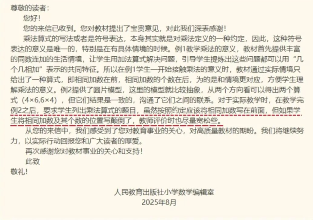出版社回复称:乘法算式的写法或者是符号表达,本身就是对乘法定义的一种约定,因此,这种符号表达的意义是唯一的,特别是在有具体情境的时候。