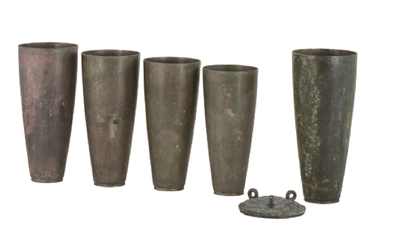 这组套杯共5件,依次套入,它们就像俄罗斯套娃一样。最外侧为带盖的青铜杯,杯身敞口,斜壁下收,平足,杯盖顶面有3环钮。杯身素面,杯盖顶面装饰同心圆纹样。套杯为酒器,多见于楚墓,便于外出使用。