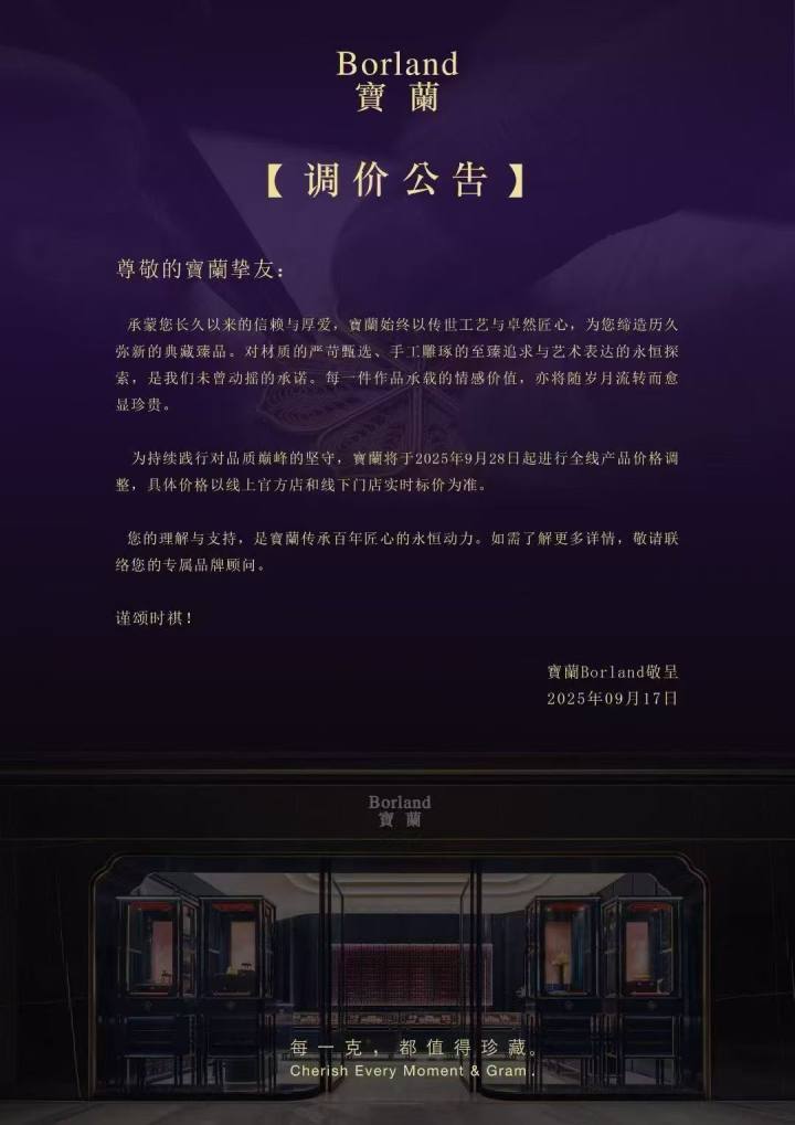 这是宝兰年内的第二次调价。今年4月,国际金价飞涨,宝兰也调过一次,当时涨幅在5%-15%。根据店员预测,这次的调价幅度在15%以上。