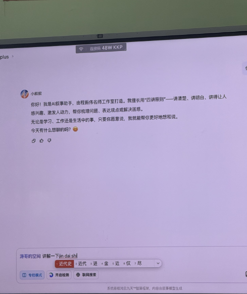 杭州电子科技大学马克思主义学院的范江涛是最早“入驻”平台的作者之一。他的《中国近现代史纲要》课是学校的爆款课程,学生称抢这门课的难度如同抢周杰伦演唱会门票一样,有些学生还“二刷”。原因就是范江涛把大家认为很枯燥的课,上得有趣生动。他常说,学生从小学开始上《思想品德》课,到初中、高中,接受了十多年的思政教育,到了大学容易产生抵触情绪。所以,他常常会结合一些社会热点事件来讲述课程内容,也习惯将一些生涩难懂的东西用打比方等方法来讲述,帮助学生理解,培养学生的理性思考习惯。所以,得知“叙事大脑”4.0版本后,他毫不犹豫地加入其中,也定制了自己的智能体。在他看来,平台的搭建与他的教育理念是不谋而合的。