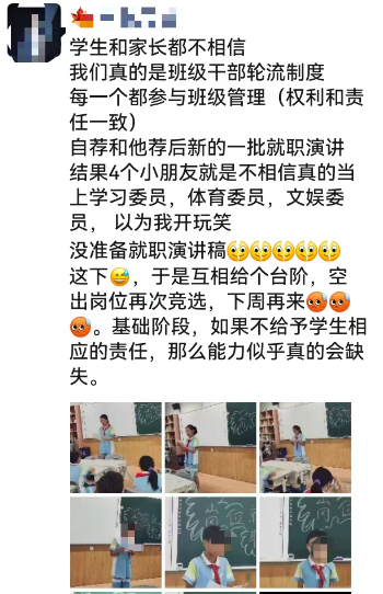 这个班的班主任吴老师发了个朋友圈说:“学生和家长都不相信我们真的是班级干部轮流制度,每一个都参与班级管理……四个小朋友就是不相信真的当上学习委员、体育委员、文娱委员,以为我开玩笑,没准备就职演讲稿……”