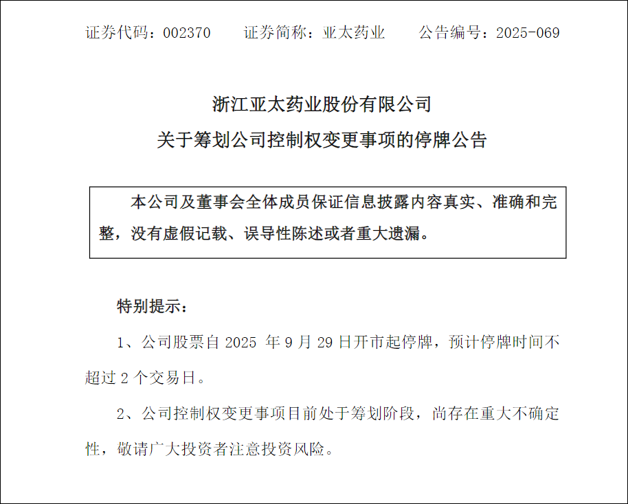 亚太药业披露,公司于2025年9月26日收到控股股东宁波富邦控股集团有限公司及一致行动人上海汉贵投资管理有限公司、实际控制人宋汉平、傅才、胡铮辉组成的管理团队及一致行动人宋凌杰的通知,其正在筹划公司控制权变更事项,具体交易方案、协议条款等尚需进一步论证和磋商,目前相关各方尚未签署正式交易协议。