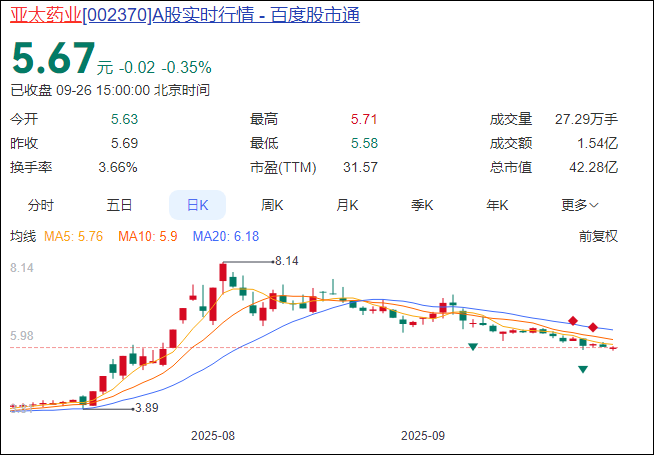 今年以来,亚太药业受益于创新药板块大涨,9月26日公司股价收于5.67元/股,年内市值涨幅达到85.9%。