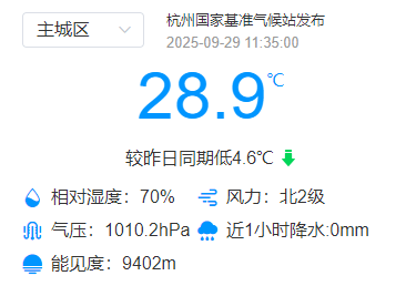 今天11:35,气温仅仅只有28.9℃,比昨日同期低4.6℃,9月26日开始的连续3天高温终于踩了刹车。