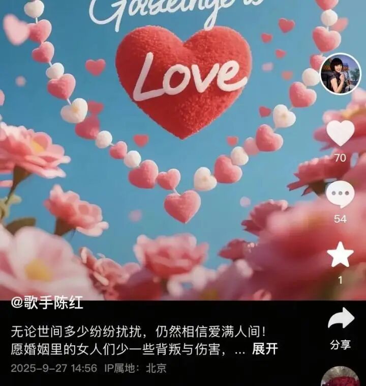 9月27日,陈红在个人抖音账号中发文称,“无论世间多少纷纷扰扰,仍然相信爱满人间!愿婚姻里的女人们少一些背叛与伤害,愿男人多一些责任与担当,常回家看看!”