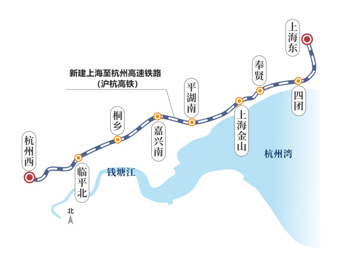 沪杭高铁西端从杭州西站出发,设临平北站,后出杭州市,进入嘉兴市境内,途经桐乡站、嘉兴南站等站点。之后进入上海境内,在金山区新设上海金山站,在奉贤区新设奉贤站,途经四团站,再利用沪通铁路二期至上海东站。