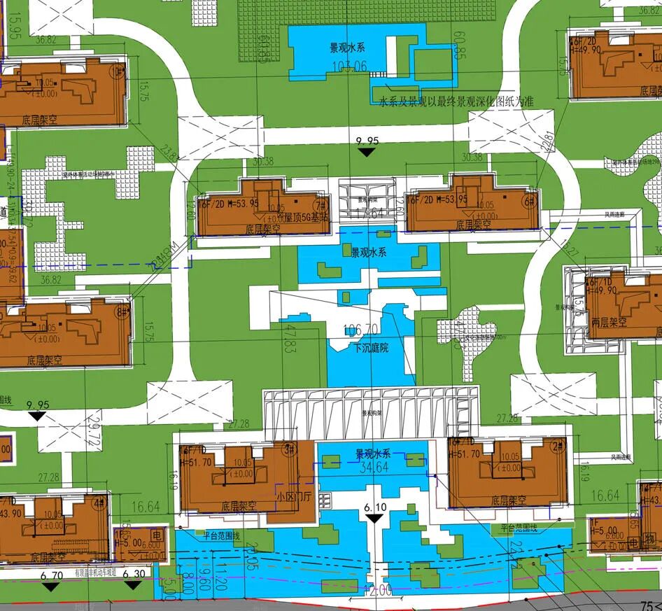 从设计图来看,这个小区地面布置了大量的景观水系。南面主入口的小区门厅外,就做了大面积的对称水景,穿过大门后,又是下沉庭院和景观水系,整体连贯铺陈,仿佛湖中小岛。