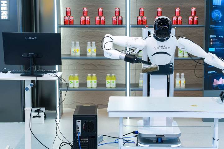 在“商业场景”板块,智元的精灵G1商超配送机器人化身为零售、仓储和物流场景的小能手,它能高效地完成商品识别、抓取、收银及货架整理等多种任务,实现智能无人化操作。即使货品堆叠得乱七八糟,也能自主调整实现稳定抓取。
