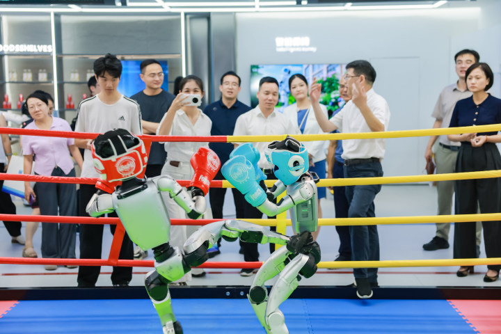最近在数贸会和云栖大会上表演格斗再次火爆出圈的宇树机器人,也把八角笼搬到了文三数字街区。凭借“智慧大脑”,U2机器人就像一位真实的格斗家一样,实时分析对手动作、预测意图并作出智能决策。
