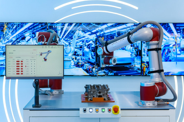 你还能看到在工厂里“打工”的机器人:在模拟的汽车发动机生产线上,节卡协作机器人(JAKA)的两款智能机械臂,就像两个默契的工作搭子,正忙碌地工作着,实现全流程作业。