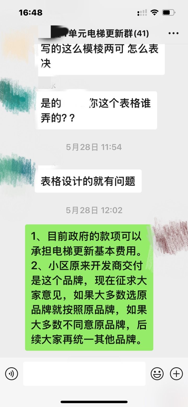 “我们要充分理解业主对于电梯更新过程中有疑问,有疑问了我们要及时解答,比如有业主说电梯使用还可以,为什么要更新?小区基本是小高层,电梯管理和维护都比较好,业主对于电梯事故感受没有那么深,不过小区的电梯毕竟有20年梯龄了,当时我们就在微信群征集意见,是否同意政府补贴款进行更新。”