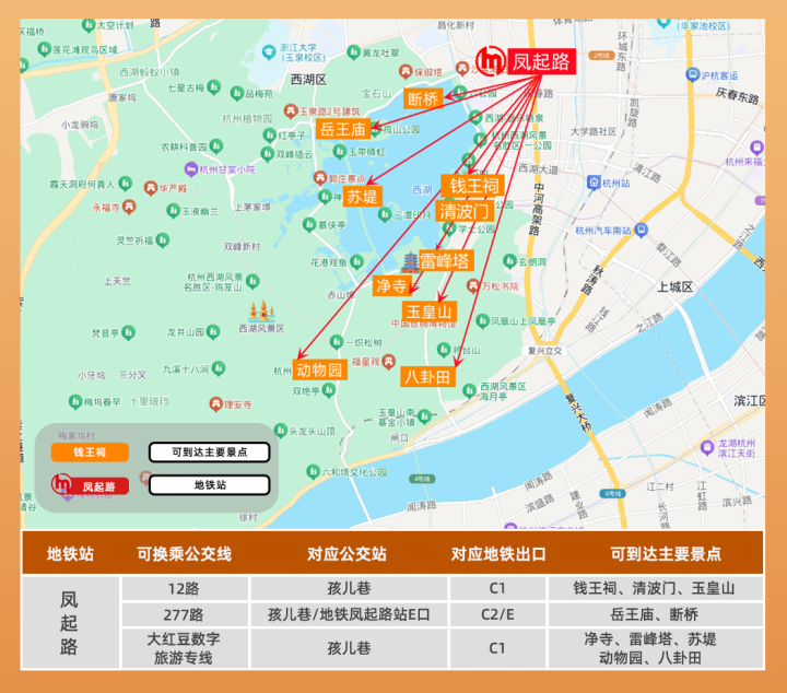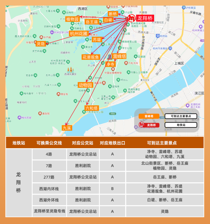 无论是从城东的火车东站方向出发,还是从城西的未来科技城片区等地出发,大家都能先通过地铁,抵达这12个重点接驳站点,随后无需多走冤枉路,出站就能找到对应的公交接驳点,坐上公交直达满觉陇、断桥、雷峰塔、苏堤等西湖热门景点,具体可参照下图,助力大家轻松游览西湖美景: